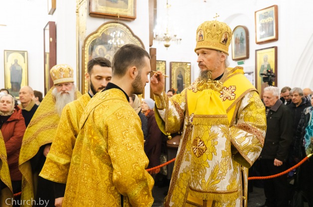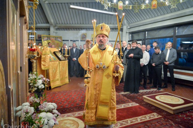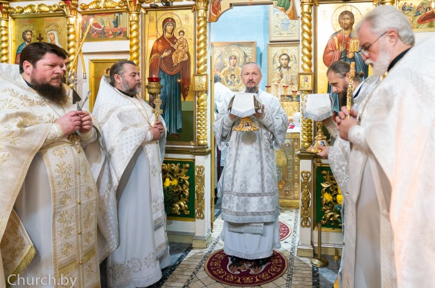 Его Высокопреосвященству сослужили секретарь Минской епархии протоиерей Андрей Волков и председатель Наградной комиссии Белорусского Экзархата иерей Дионисий Ковалев. На богослужении молились сотрудники Минского епархиального управления.